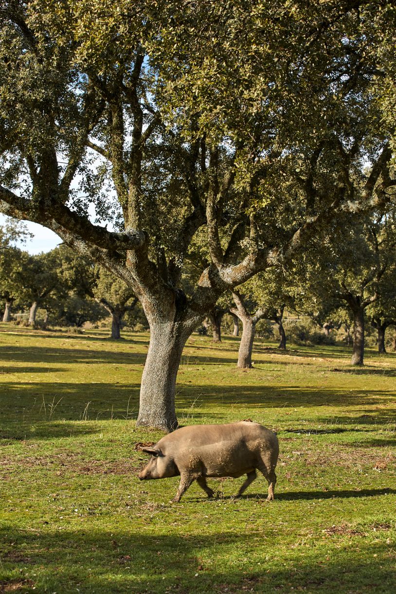 Su genética ibérica aporta la infiltración de grasa justa, sabor persistente y textura aterciopelada, mientras que su crianza al aire libre garantiza una fibra firme y un perfil aromático elegante y prolongado.